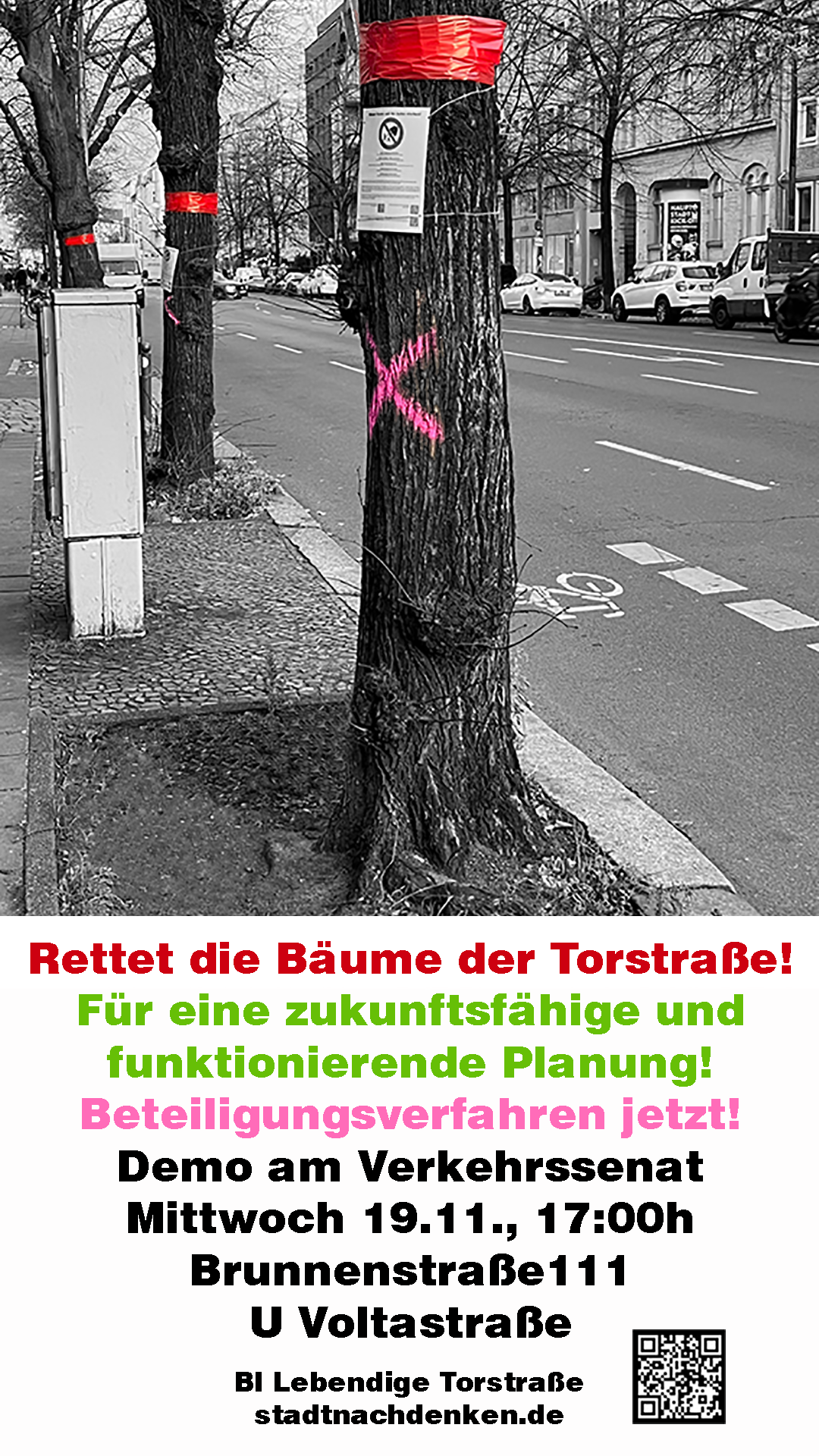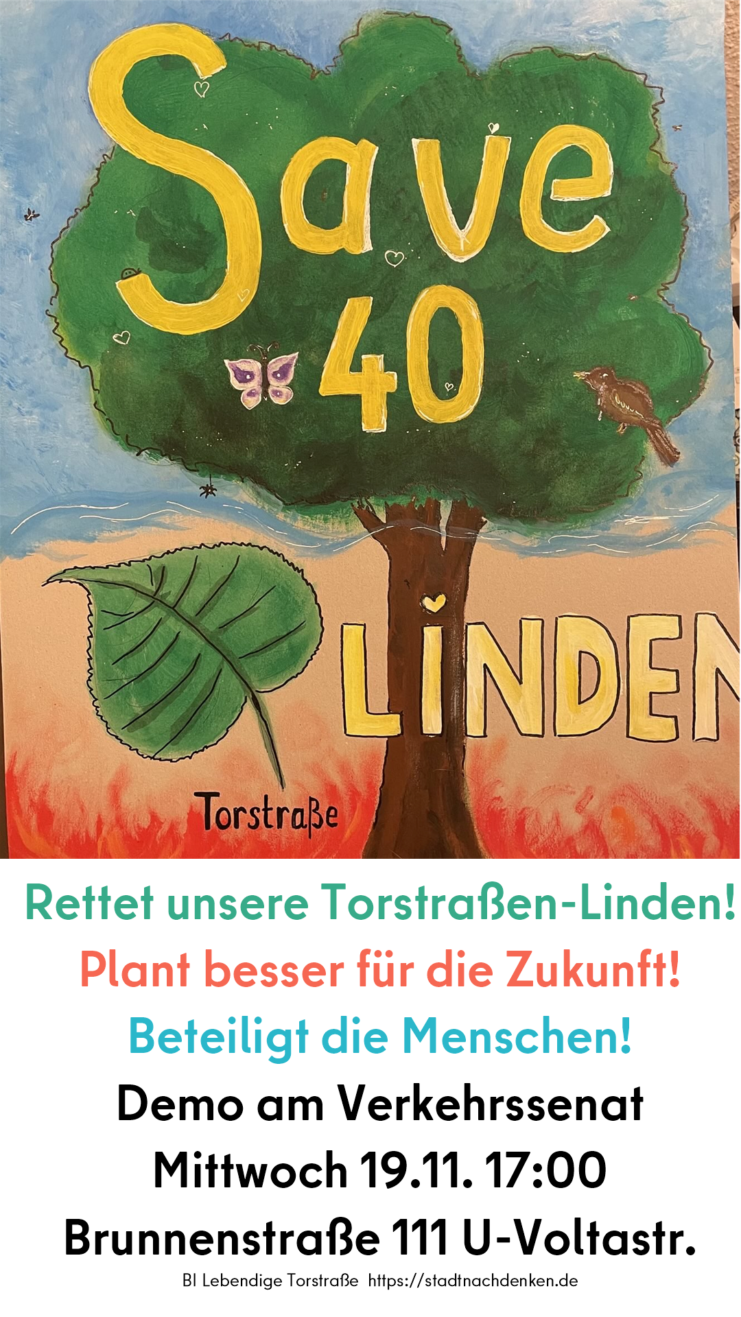 Für die Rettung unserer Linden in der Torstraße! Für eine zukunftsfähige Planung, die klimaangepasst ist und Sicherheit für alle Menschen auf der Torstraße bietet. Und für die Beteiligung der Menschen mit all ihrem Wissen und ihren Alltagswirklichkeiten.