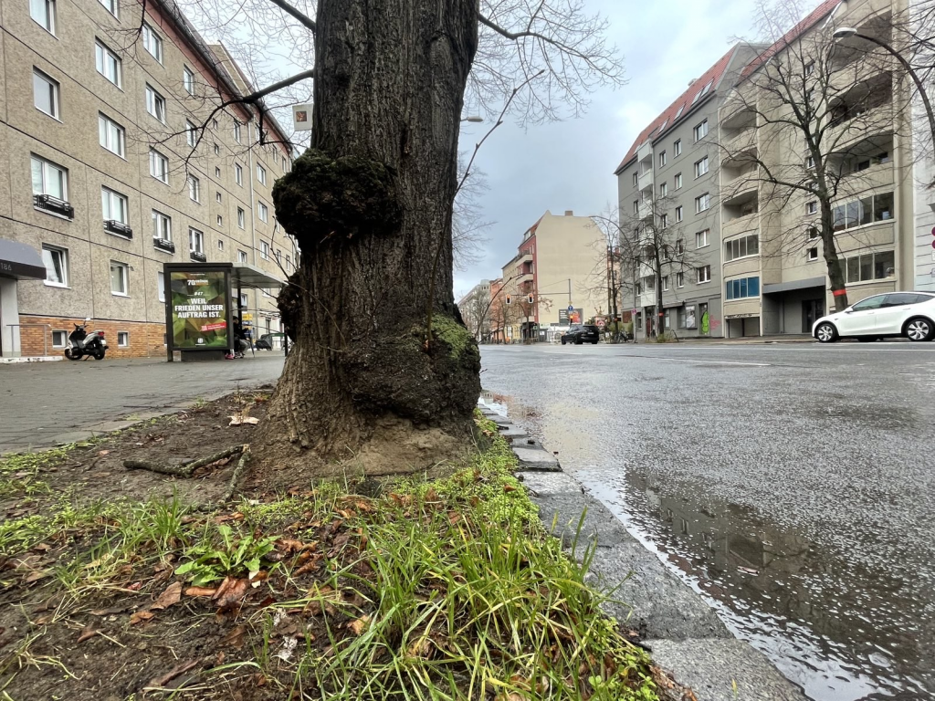Dieser Baum, fotografiert aus Fuchsperspektive, steht zu nah an der Straße, genauer: an der Fahrbahn. Sagen die Menschen, die für die Umgestaltung der Torstraße verantwortlich sind. Aber ist nicht die Straße zu nah am Baum? Die Straße könnten wir ändern, den Baum wollen wir möglichst erhalten. Falsch gedacht? Richtig gedacht! Sagt auch der Fuchs.