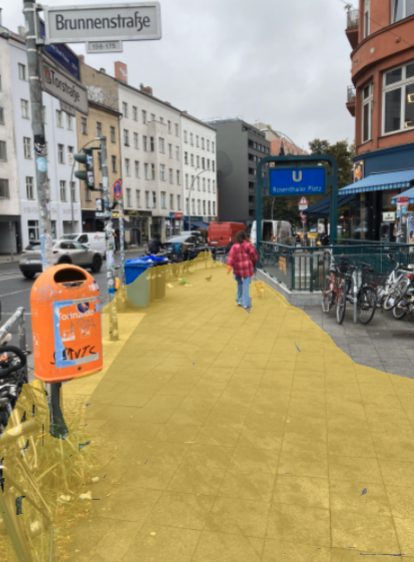 Die gelbe Fläche im Bild wird künftig nicht mehr Gehweg-, sondern Fahrbahnfläche sein, von der heutigen Fahrbahn am linken Bildrand bis zur U-Bahn-Treppenanlage. Der verbleibende Raum zwischen U-Bahn-Abgang, Aufzug und den Häusern wird dann auf gar keinen Fall mehr Ausschankfläche sein können, da muss „der Verkehr durch“, diesmal allerdings der Fußgängerverkehr, Kinder auf Rädern, Rollifahrer und so weiter.